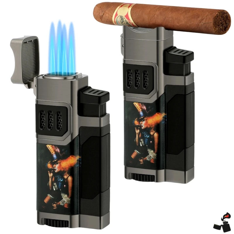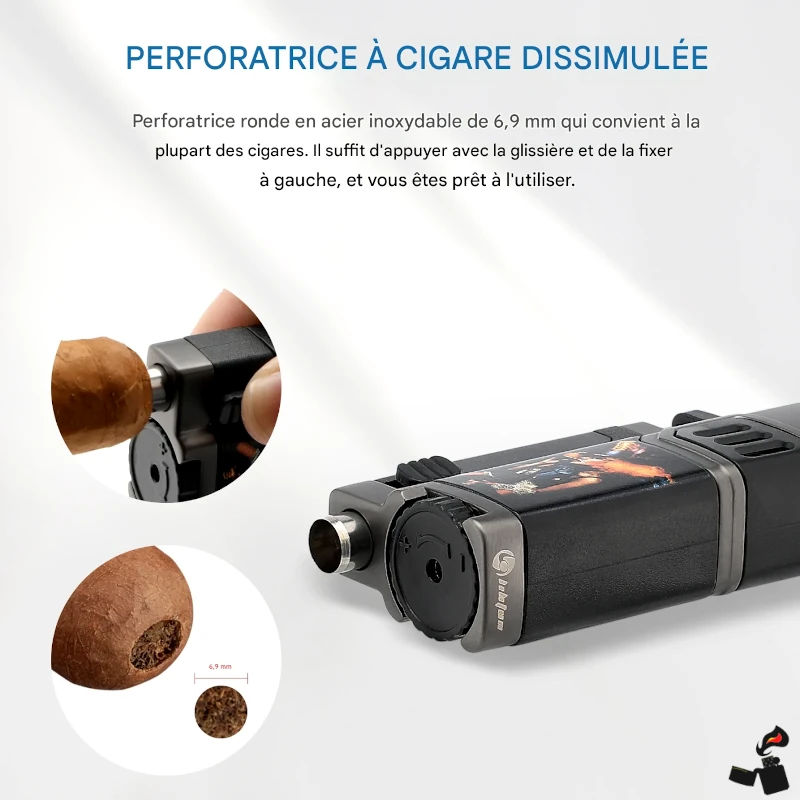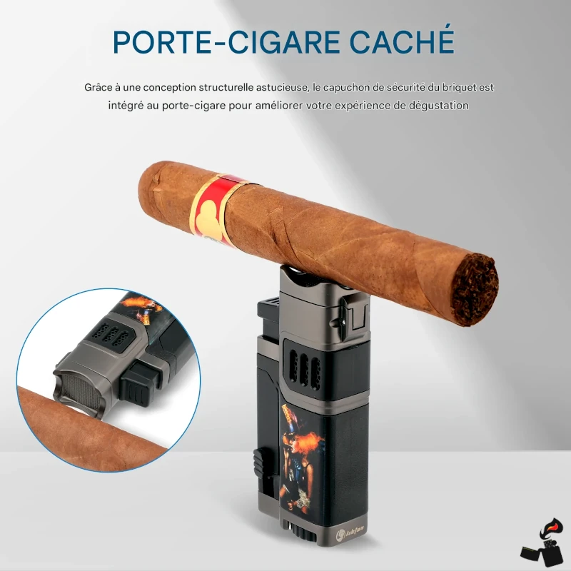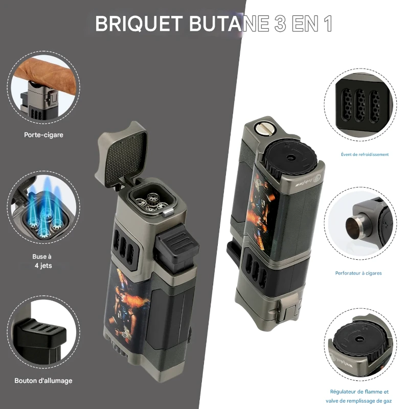 Briquet multifonction 3-en-1 : 4 flammes bleues coupe-vent, coupe-cigare intégré, perforatrice dissimulée et porte-cigare magnétique.
