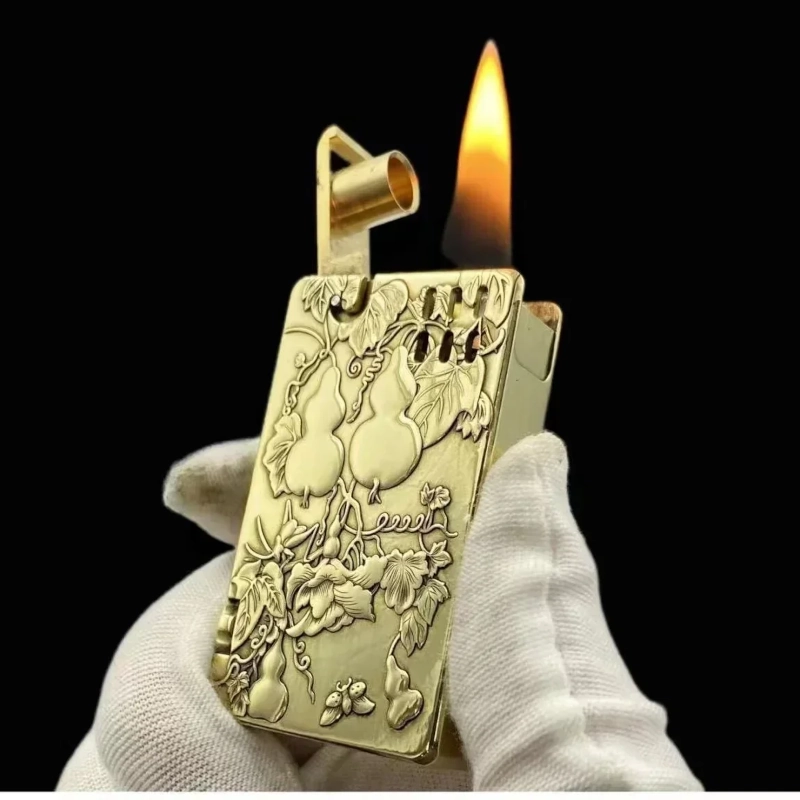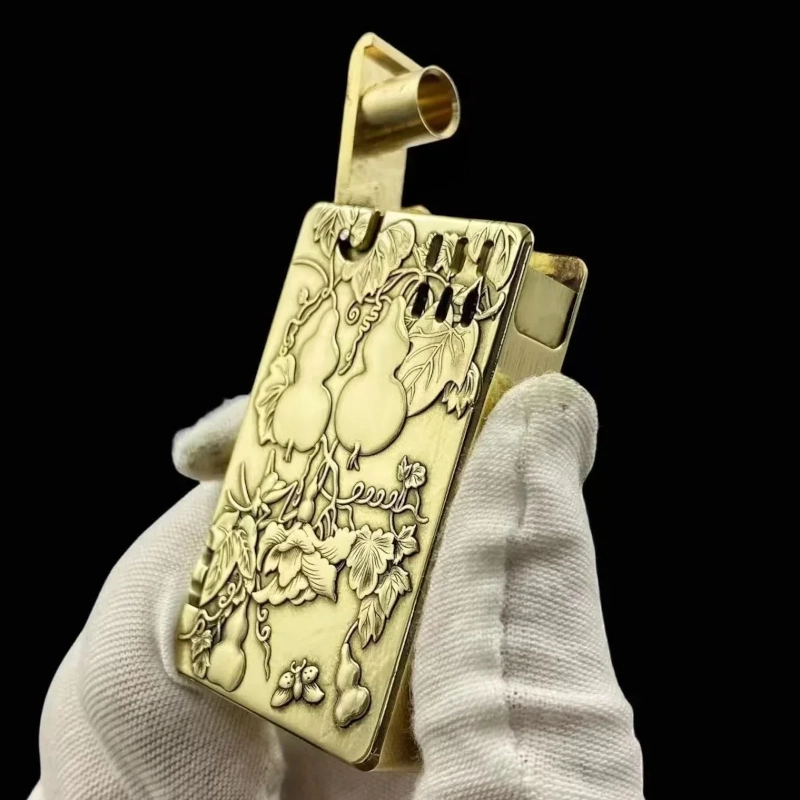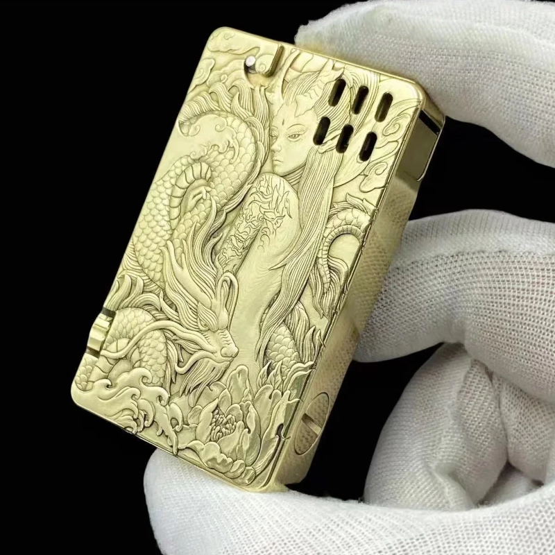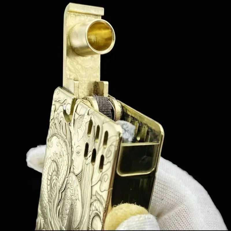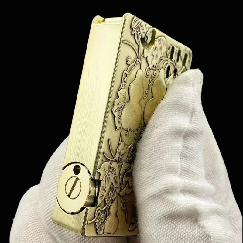 Ce briquet à essence en laiton se distingue par son mécanisme d’allumage à catapulte semi-automatique, activé par une simple pression, offrant un déclenchement mécanique net et contrôlé. Son corps en laiton massif est travaillé avec une gravure profonde double face, réalisée par procédé laser et finition polie, apportant du relief et une texture marquée au toucher. Le réservoir interne offre une bonne capacité pour un usage régulier avec du kérosène standard. Compact et dense, ce briquet propose une prise en main stable et un fonctionnement simple, adapté à un usage quotidien ou à un objet de collection.