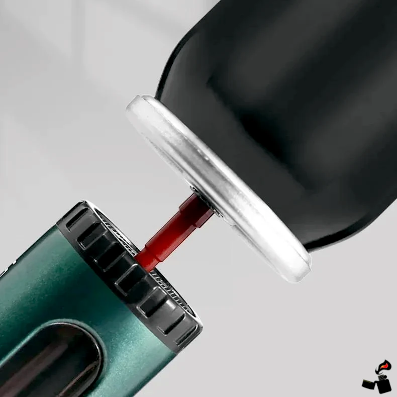 Le port de gonflage rapide situé à la base permet un remplissage simple et propre avec du gaz butane standard. La molette de réglage offre un contrôle précis de la taille de la flamme.