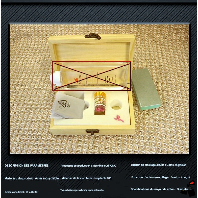 - Pierre de rechange : intégrée dans la vis de remplissage